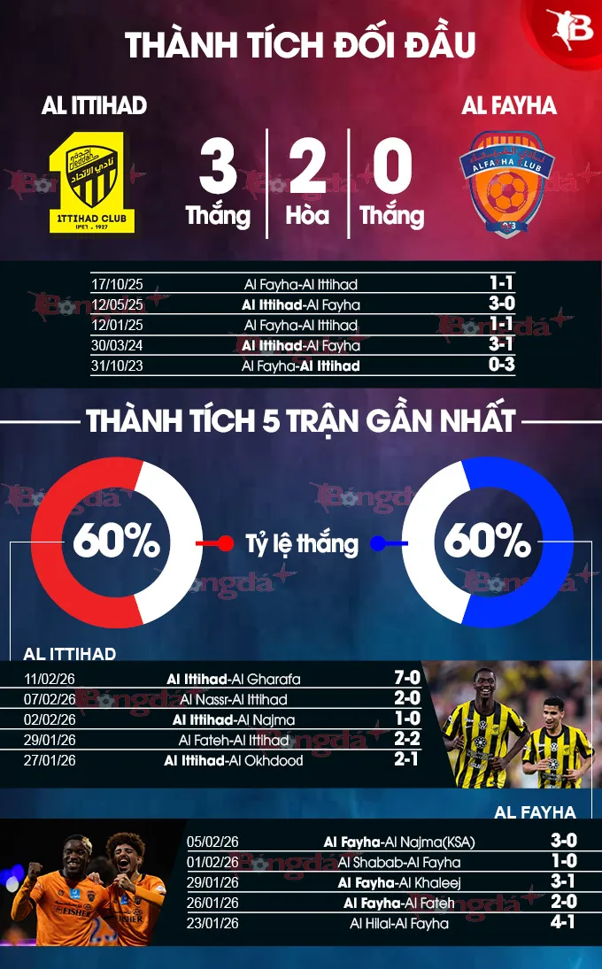 Lịch sử đối đầu cũng nghiêng hẳn về phía Al-Ittihad với chuỗi 10 trận bất bại liên tiếp trước Al-Feiha. Kết hợp với lợi thế sân nhà, viễn cảnh Al-Feiha trở về tay trắng là rất cao.