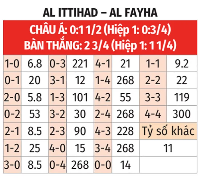 - Tỷ số lẻ: Xu hướng tỷ số lẻ khá rõ khi 5/7 trận gần đây của Al-Ittihad và cả 3 trận sân khách vừa qua của Al-Feiha đều kết thúc với tổng bàn thắng là số lẻ.