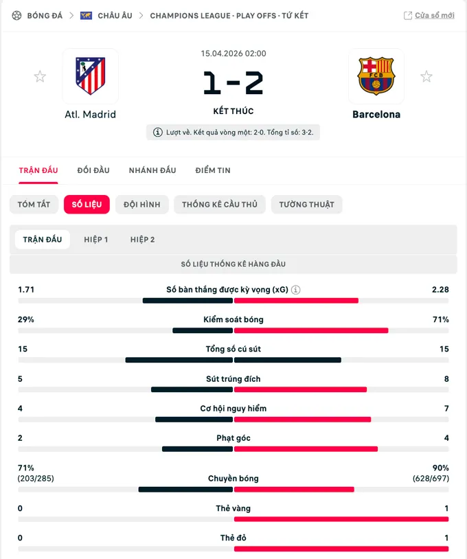 Tổng tỷ số hai lượt: Atletico Madrid 3-2 Barcelona