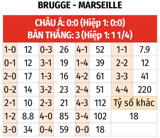 - Bùng nổ ngay từ hiệp 1: 6 trận liên tiếp của Club Brugge đều có từ 2 bàn thắng trở lên trước giờ nghỉ giữa hiệp. Marseille cũng có 3/4 trận gần nhất kết thúc hiệp 1 với ít nhất 2 bàn.