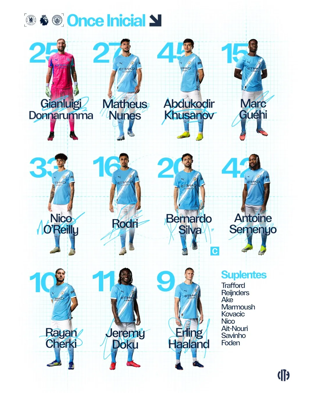 - Man City (4-2-3-1): Donnarumma; Nunes, Khusanov, Guehi, O'Reilly; Silva, Rodri; Semenyo, Cherki, Doku; Haaland.