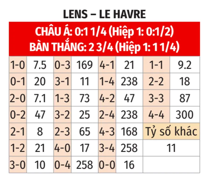 - Lens ghi bàn sớm: Đội chủ nhà có thói quen mở tỷ số ngay trong hiệp 1, không chỉ trong các trận gặp Le Havre mà còn ở phần lớn các trận đấu gần đây trên sân nhà.