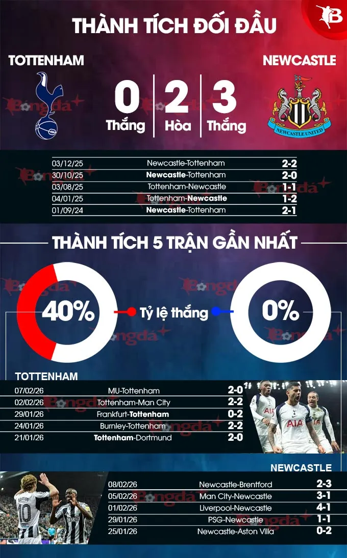 Yếu tố tâm lý hoàn toàn thuộc về "Chích chòe". Thống kê đối đầu cho thấy Newcastle thống trị với 6 chiến thắng, 1 trận hòa và chỉ 1 lần thua trong 8 lần chạm trán gần nhất. Đặc biệt, ở lần gần nhất làm khách tại London, họ đã xuất sắc đánh bại Tottenham với tỷ số 2-1.